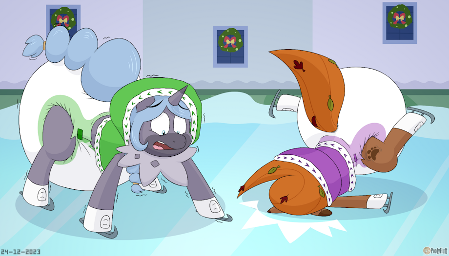 Luff is doing her best to keep her balance, Wuff got a face full of ice.