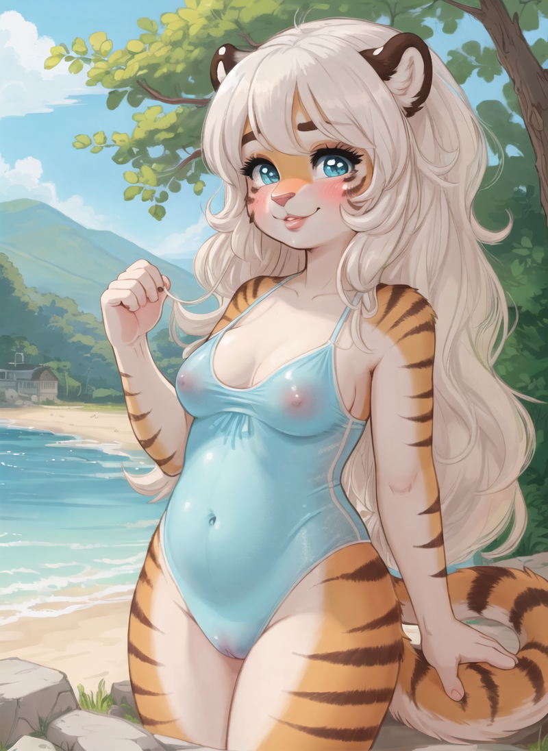 1girl, (warm smile, blush), lips, green eyes, shimmering eyes, bright eyes, , anthro, tiger, white hair, long hair, wavy hair, blue eyes, furry female, adult, medium breasts, collarbone, tiger tail,