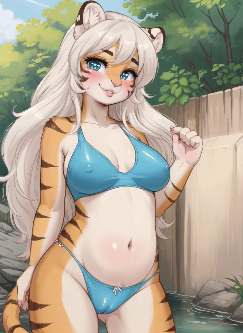 1girl, (warm smile, blush), lips, green eyes, shimmering eyes, bright eyes, , anthro, tiger, white hair, long hair, wavy hair, blue eyes, furry female, adult, medium breasts, collarbone, tiger tail,