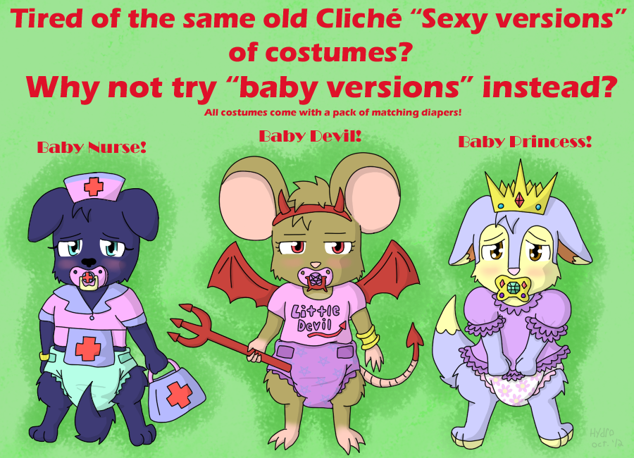 We've all seen the "sexy nurse", "sexy devil" and "sexy princess" costumes on Halloween, but I think these would be more appropriate for some of my watchers. And for those of you who think these are only for girls, well just look at that little Lupe on the right! He's happy (snicker) to show these are all genders!