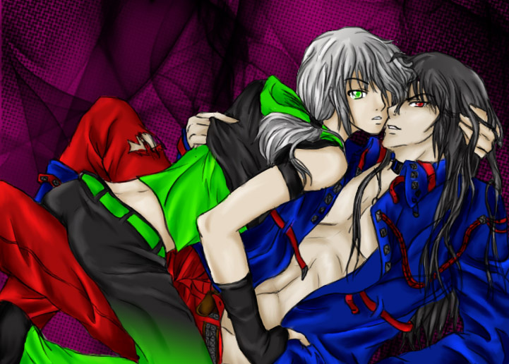 An old pic I dug up lol. Its a Danny Phantom fan art, for one of my writers that lives in Canada. The white haired boy is Danny Phantom when he is 18, and the other is my 20 year old OC Alexander Masters (Alex). He is Vlad Masters only son, and unlike daddy dearest he is quite a rebel. Sleeping around with anyone that has a pretty face. He was taken as a toddler and raised by an evil ghost, for years. He is now in the custody (probation) of ClockWork. Needless to say he takes an interest in young Danny.