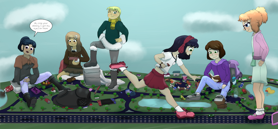 Vivian watches the others play around in a tiny town. I dunno, just wanted to do something with the main characters to my comic.