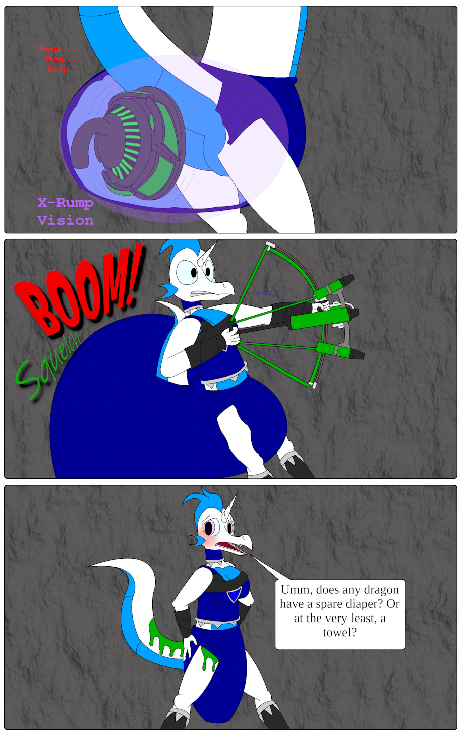 First Panel: An x-ray view (jokingly referred to as “X-Rump” view) of Nixie’s diaper butt, showing a green curling bomb under her tail and in front of her butt. She is clad in a Dark blue scale diaper. The Curling Bomb is vibrating and beeping.