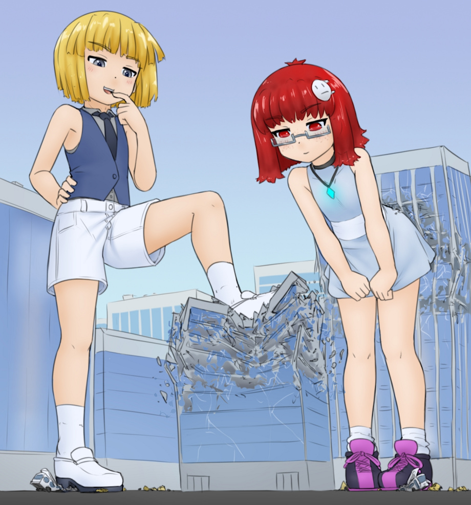 Nice shorts-stomps! That's quite the expression Rika has going there. Rini watching so intently that she accidentally buttbumped the building behind her is really good, unintentional destruction is always fantastic. I like her expression too! She's quite pleased.