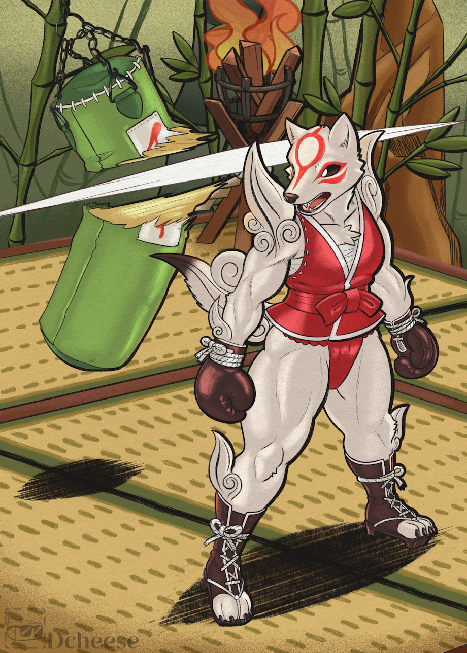 featuring Amaterasu from Okami, doing her own style of bagwork on a thematically relevant punching bag.