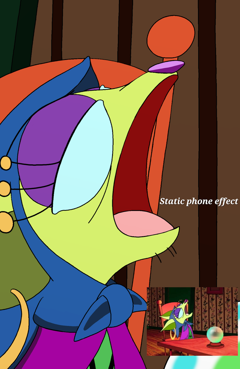 In one of the episodes of Courage the Cowardly Dog Eustace heard of his brother passing away and he left behind treasure. Eustace, as corrupt and selfish as he is, "hired" Shirley to come over to his house to perform a communication method that allows him to talk to his dead brother. I've been wanting to draw this specific scene for years now, but my drawing skills waaaaay back then sucked. Many years later I finally did it. In this actual scene Shirley opens her mouth wide, tilts her head back slightly and just shuts down with her eyes being left blank to allow the one she's contacting to take over temporarily by having them speak from inside her mouth without her actually moving her mouth, kinda like telepathy. thought this was the weirdest and cutest scene to see this little green gypsy dog do this so I planned to draw it one day. What made the scene funnier was while her body was comatose static phone noises were coming out of her mouth.