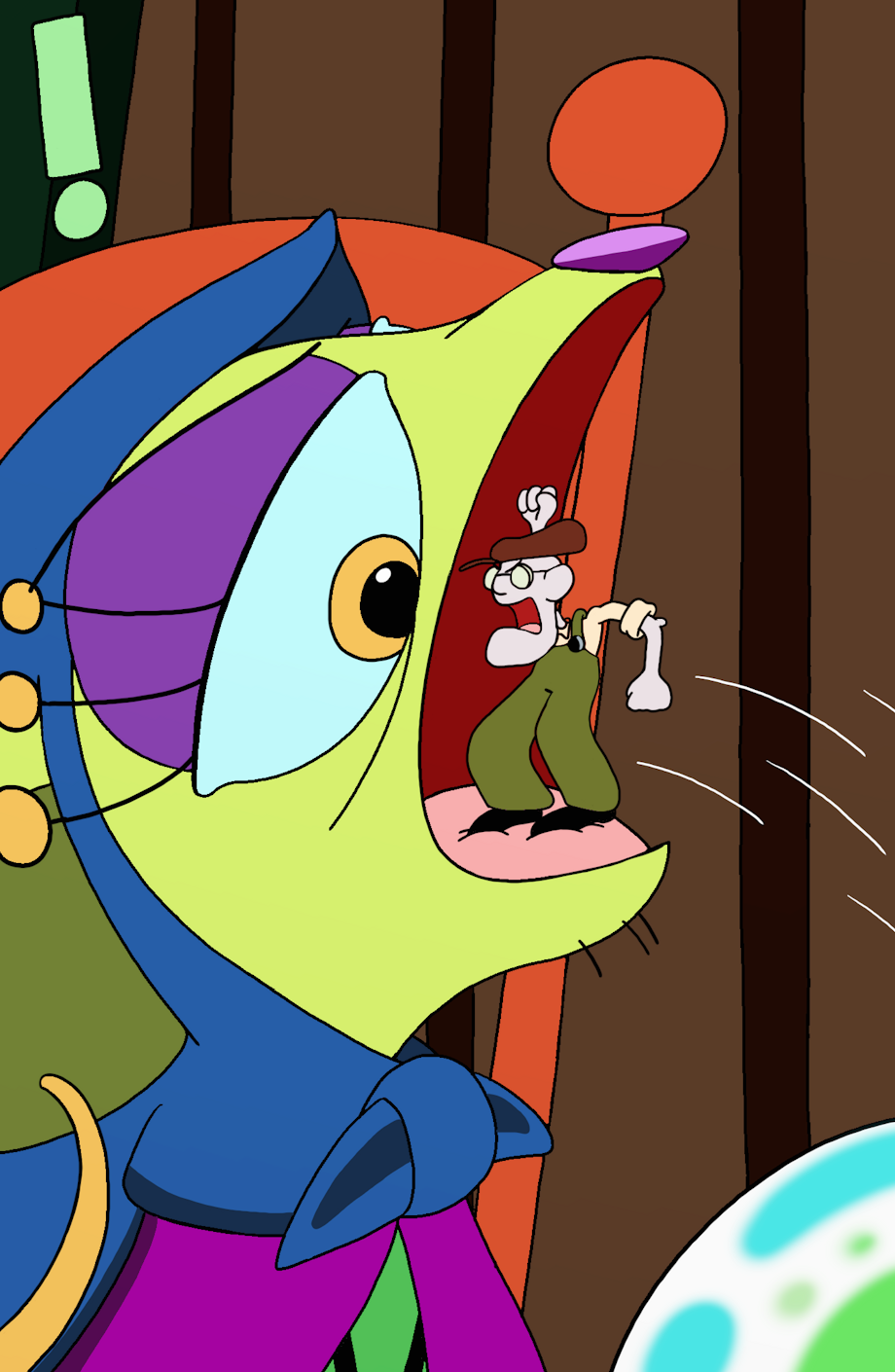 I decided to go further like I usually do and get creative. Eustace somehow....wait for it............................shrunk down to size and angrily hopped inside of her mouth to demand from his brother where the treasure was. This woke Shirley up from her trance and she angrily threatened to swallow him whole if he doesn't get out of her mouth.