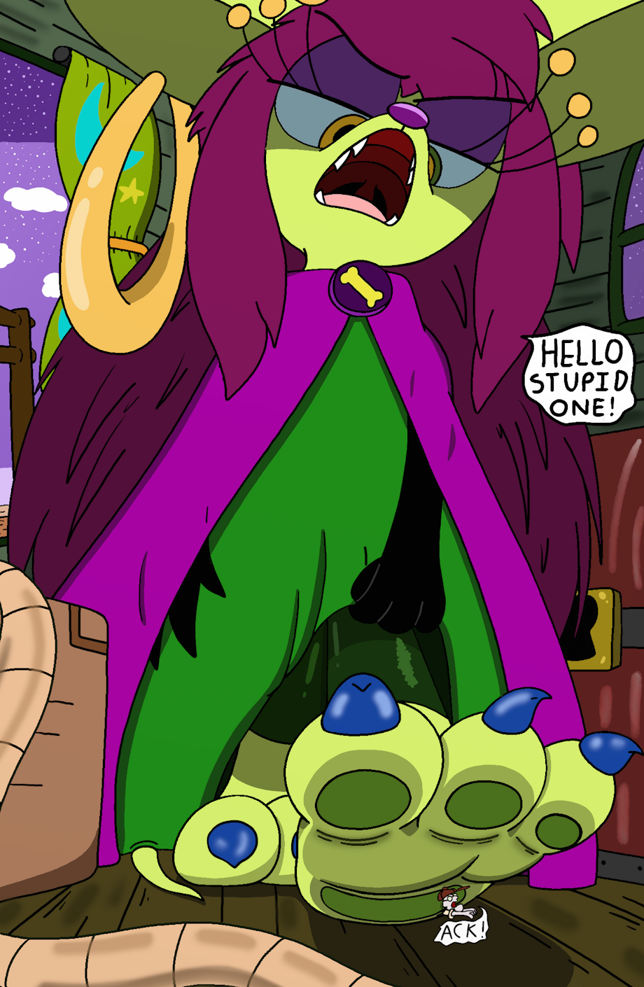 Looks like Eustace did something stupid again that angered the spiritual medium so she captures him with her magic, shrinks him and brings him to her home (a mobile gypsy wagon she travels around in) and begins punishment him by nearly crushing him under her feet to here him beg for mercy among other punishments she has planned for him.