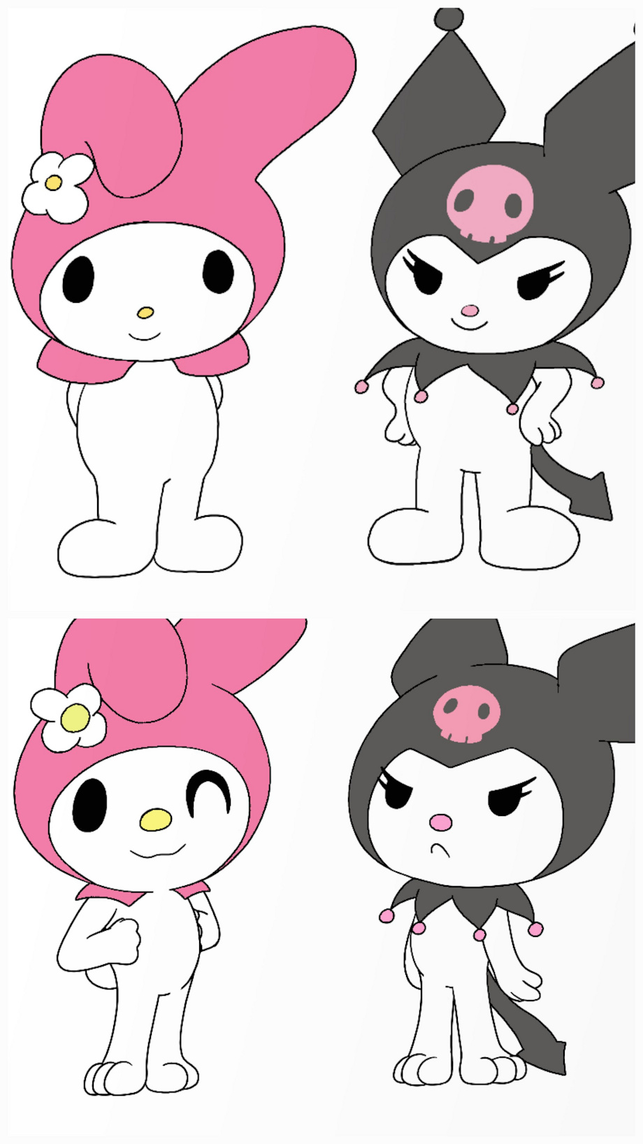 Hello Kitty art, not to be confused with the original Hello Kitty that has a little girl wearing a cat costume. This is the one with the cute little anthros in a very cutesy setting. I've never seen the show to let you all know, BUT I'm familiar with the show's setup and both of the characters in this picture My Melody and Kuromi with Kuromi being the most popular one among the two. I'm not kidding about that either since I know people, mainly girls, who deck themselves out with Kuromi accessories and merchandise over My Melody. Their personalities differ greatly. You have My Melody who9the nicest thing that there is, but she's an air-headed idiot. Then you have Kuromi who acts tough and edgy and in the cutest way possible. She also leads her own gang. Kuromi and Melody are friends though despite any differences they have.