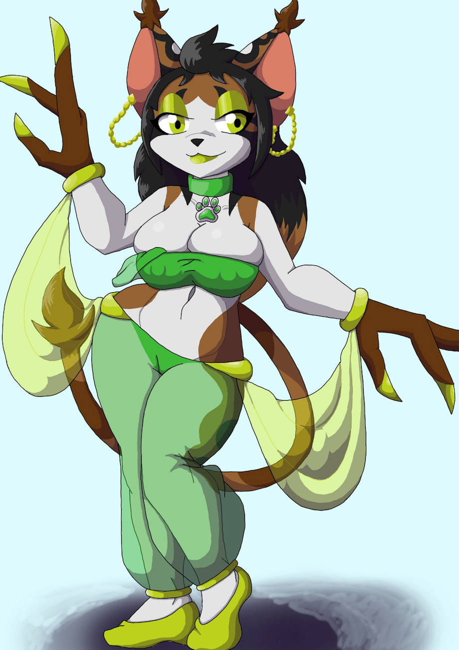 And here's the first of the new year from me, which is ironically enough Mikki again. This time she's slightly extra with her outfit, with the cuffs of her gloves being gold bracelets, her claws/nails being gold/golden to match her golden makeup; special gold chain earrings that dangle and swing as she moves, and light sashes that drape between her hips and wrists. I also made her top sheer/transparent like her pant legs, but made her wrap it around her to make it more opaque, though you can still see the outline of her nipple/areola through it. I wanted to put her in a pose similar to that one Shantae belly dancing gif, since she too is a belly dancer. I also tried to use a different way of inking to help speed things up when making art. Hopefully, it'll work better when I continue work on this series of slightly extra digikitties. Anyway, hope you all enjoy her, and have a good new year.
