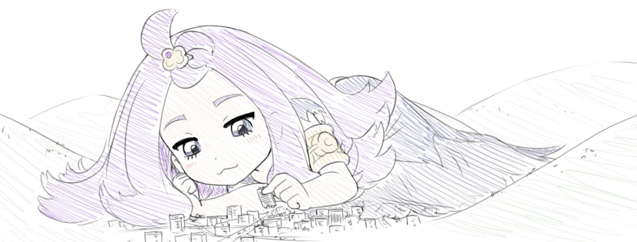 Awwww, this is an adorable idea! She really is like a mountain at that size! Her smile as she plucks up an entire skyscraper inbetween her fingers is so precious! It gives off such a playful and innocent vibe. I really do love seeing buildings that small, hand interaction's a treat! Her massive bit of hair flooding into the city too, hahahha. Great sketch!