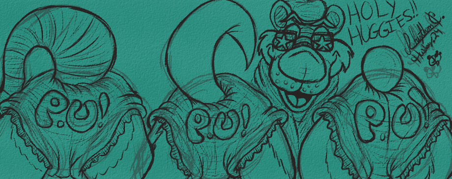 showing off our diaper Butts with P.U written on them to Dexter the Diapered Director.