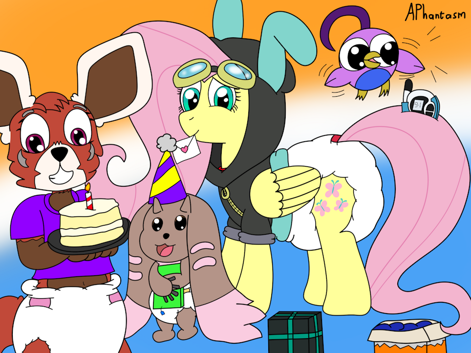 This time featuring a padded trio in the form of his OC Faye the Red Panda, Lopmon from Digimon and Fluttershy from MLP: FIM (favourite Digimon and favourite pony if I'm not mistaken) presenting gifts and a homemade lemon cake for the occasion. Of course that purple Angry Birds lookalike Tickle Wickle had to be featured too! XD