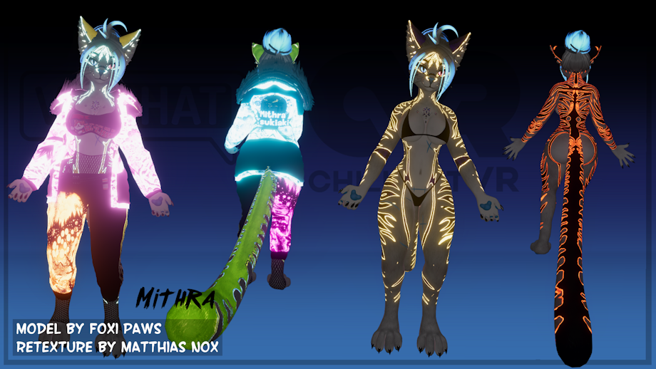 If you like what you see and you're interested in an avatar retexture of your own – you can find more information here: https://www.furaffinity.net/view/48238164 Find me on Discord as matthiasnox and I'll be happy to help!