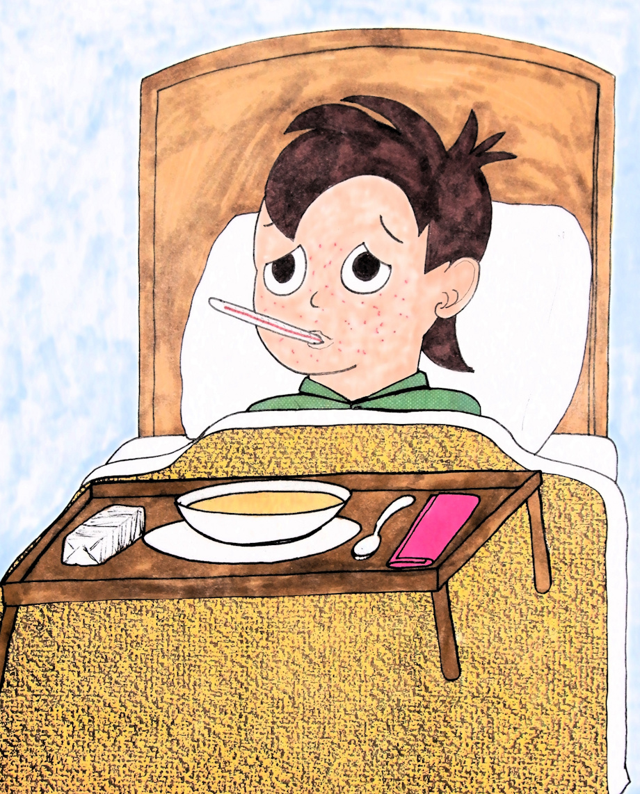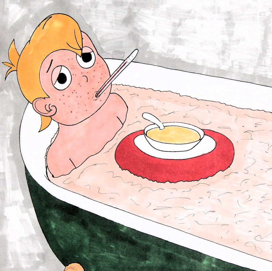 These fanarts requested by GoldJeff03031996 center around that particular condition. The characters in these pictures are from The Oz Kids. The first one, Frank Diggs, hopes an oatmeal bath combined with a bowl of chicken soup will cure him. The second boy, Neddie Hugson, would rather just stay in bed and have the soup.