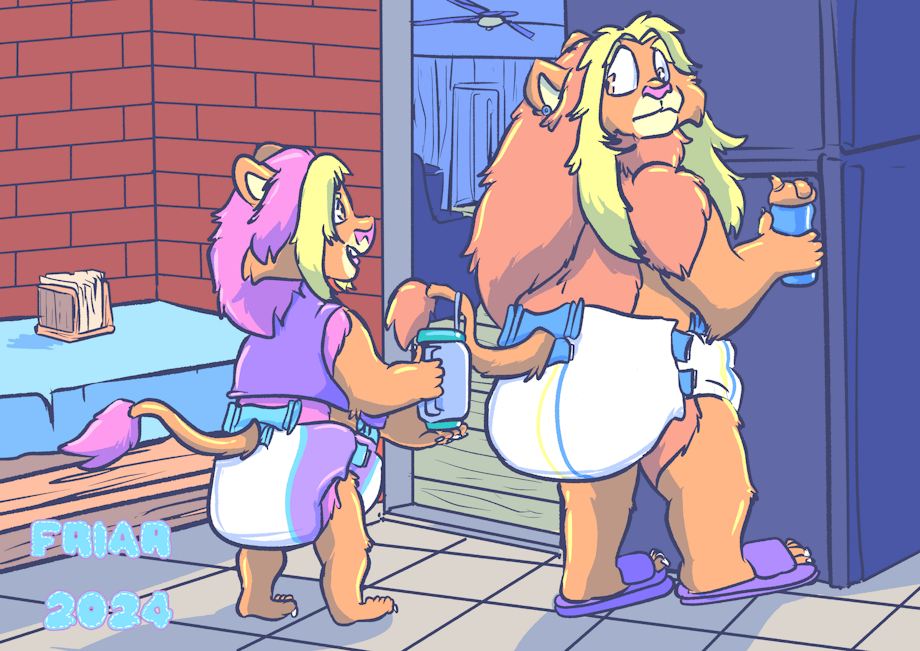 Illustration of Friar the wet and messy diapered lion holding a blue and teal sippie cup, catching his dad Barrett the wet and messy diapered dad lion borrowing Friar's orange and blue sippie cup in the kitchen. Barrett looks behind himself bashfully.