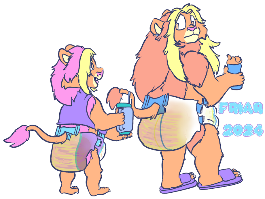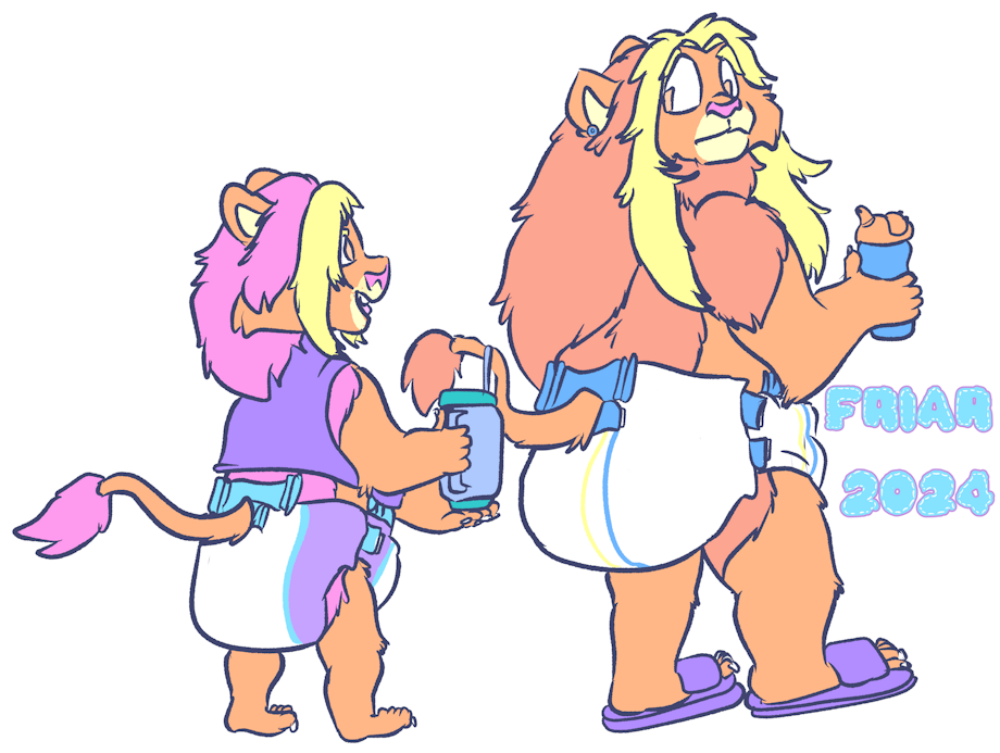 Illustration of Friar the wet and messy diapered lion holding a blue and teal sippie cup, catching his dad Barrett the wet and messy diapered dad lion borrowing Friar's orange and blue sippie cup in the kitchen. Barrett looks behind himself bashfully.