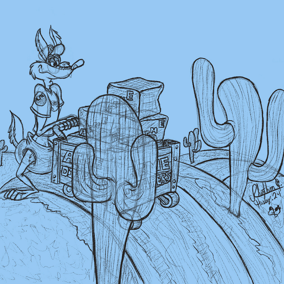 Who's that coyote walking up the road wheeling a wooden cart full of ACME Diapersfrom ACME? Why it's Deven E. Coyote the Acme Diaper Delivery service coyote bringing a pack of Acme diaper to a toon somewhere.