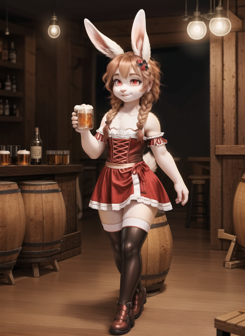 <lora:barma1d3n:0.5> barma1d3n, dirndl, cleavage, german clothes, beer, mug, beer mug, thighhighs, twin braids, barrel,