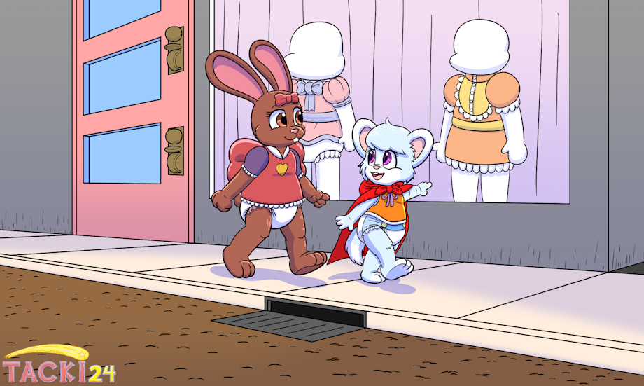Jessica is a light blue furred chinchilla girl with purple eyes. She is wearing an orange dress with a purple bow and white stripe at the hem of it. She is wearing a blue accented disposable diaper. She has a red cloak tied around her shoulders with a hood. She is smiling and excited as she talks to Amy and points out the dress.