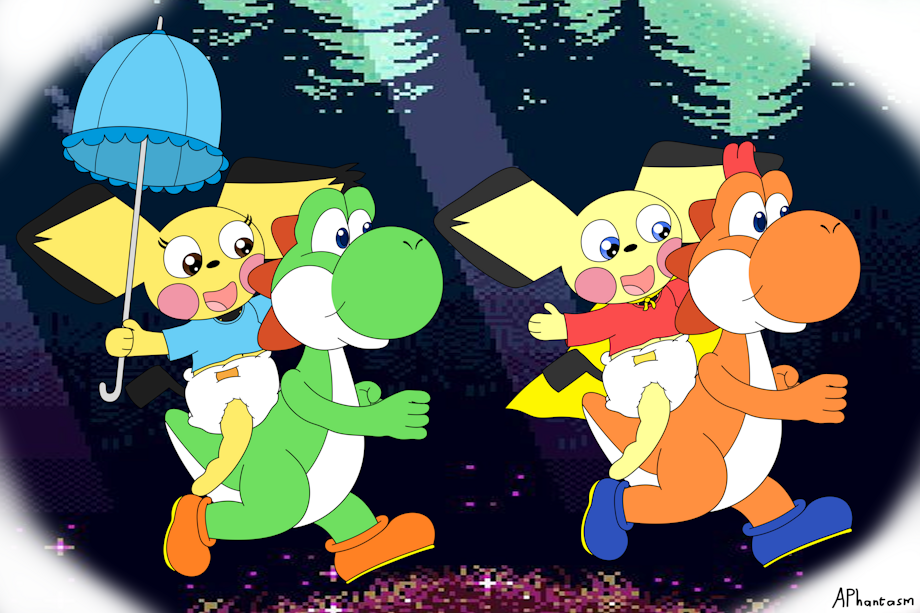 A gift art for my friend https://inkbunny.net/DanielMania123's birthday, featuring his Baby Pichu OC Bolty and my Baby Pichu OC Tamara having a playdate with an orange Yoshi and green Yoshi respectively.