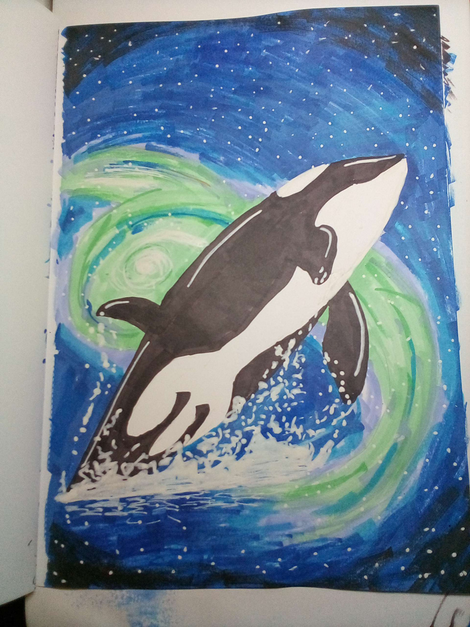 [ID: A drawing of an orca breaching out of a galaxy. /ID]