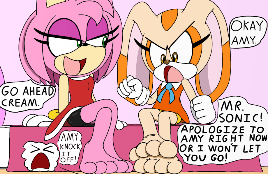 Amy could do a variety of things to Sonic now. However she decided to let Cream "punish" him instead by politely pressuring him under her big feet (because big Mobian feet are big), despite Sonic doing nothing wrong to end up in her boots in the first place. Cream is very good friends with Amy and looks up to her as a big sister so she happily obliged to make Sonic "apologize" to Amy when it should be the other way around.