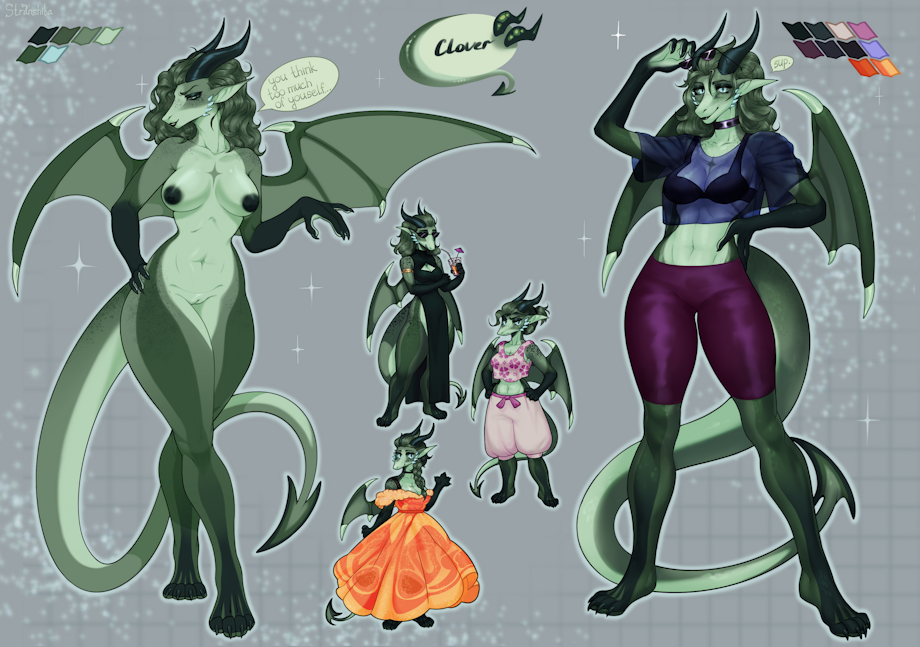 Ooooo! I been want to post this for so long. ^^ Here's my lovely green dragon girl, Clover. She's sassy, confident, and flirty. She's a girl that loves fashion and enjoys dressing up in a lot of outfits that fit her taste. A girl that knows what she wants and how to get it. Knowing when to strike first then she sees an opportunity in front of her. She loves to look her best in any sort of way even if it's just casual. Very flirtatious and outspoken knowing how to keep calm in most stressful situations not wanting to let out her true feelings to others.