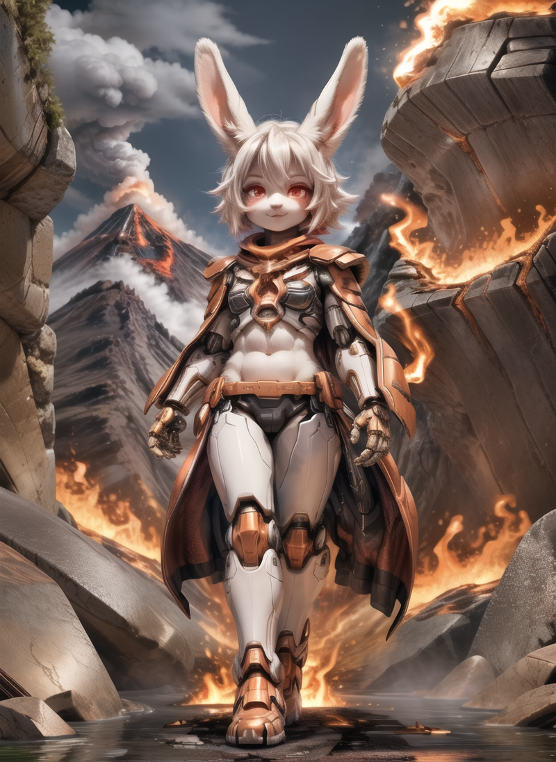 outdoors, red cape, walking, (volcano:1.25), (molten rock:1.25), (fire:1.25),