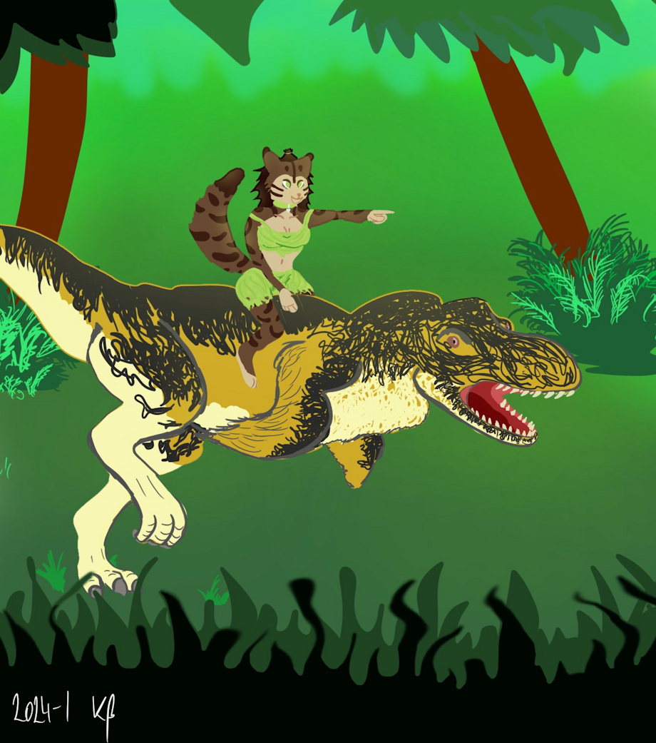 Finised piece. Silvia (the cat) rides a dinosaur through the jungle.