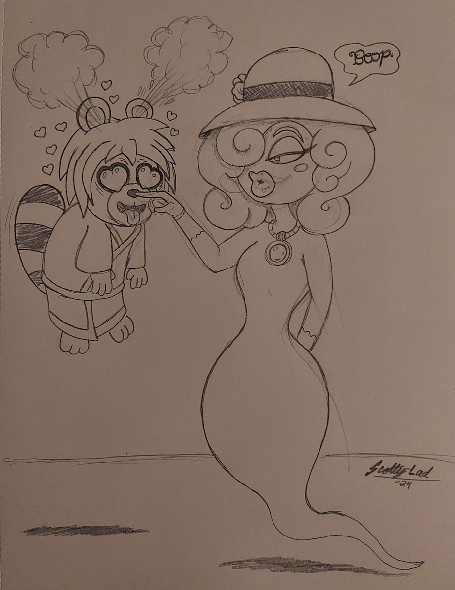 It’s been a short while (even shorter from their perspective), but Toshi and Val have been getting along famously. Who would’ve thought a cute ghost girl and a human/tanuki hybrid could make for such a cute couple? Right now Toshi is showing her his shapeshifting power, and is showing off his favorite form. Which Val seems to think is absolutely adorable… and she’s completely right.