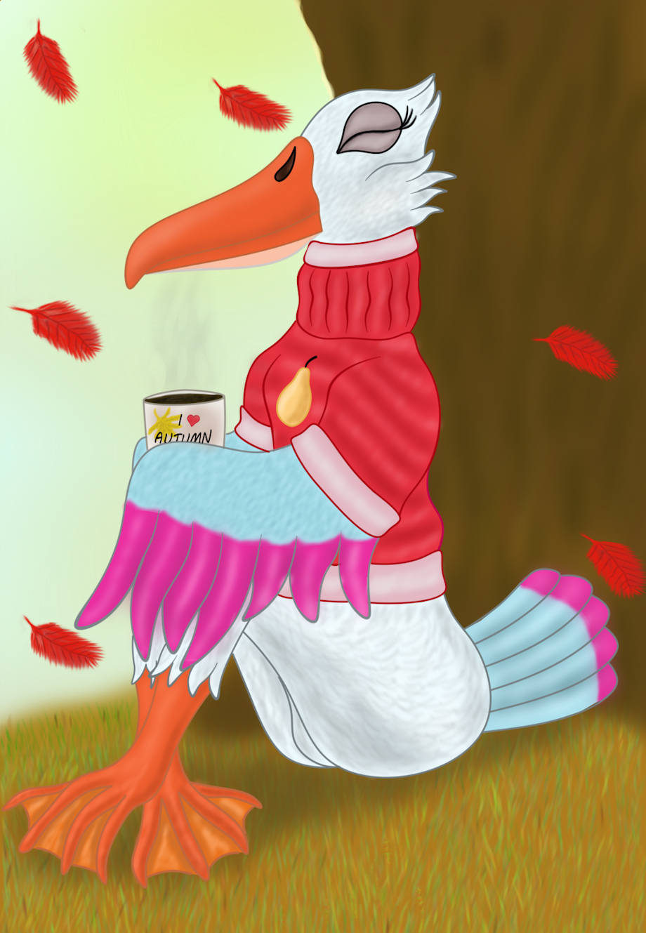 Philippa is enjoying the last rays of the autumn sun, letting it warm her feathers and sipping an insides warming cocoa drink under a tree bark.
