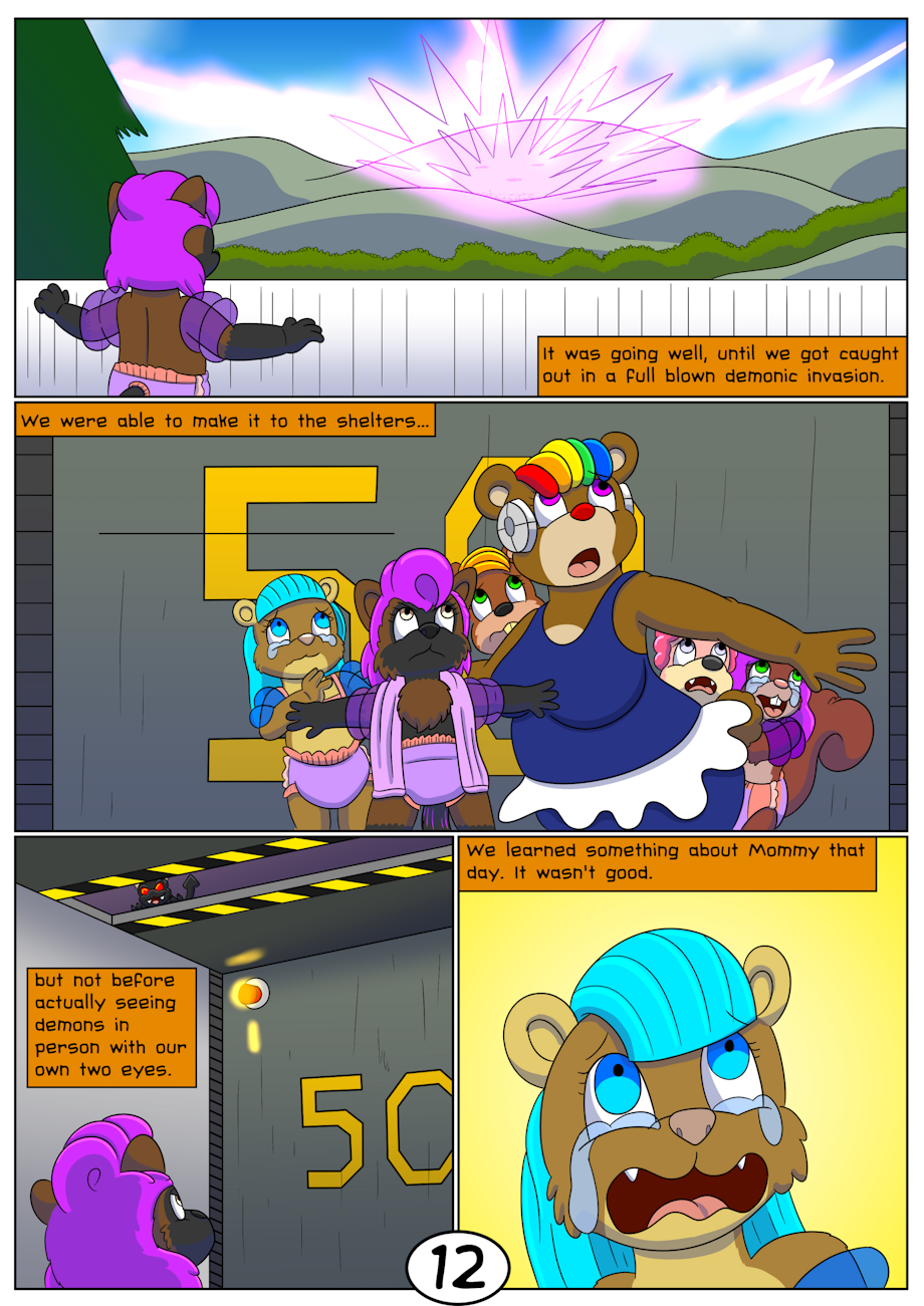 Panel 64: Leika is in a school kids outfit. It is a blue skirt with short sleeves, a white apron, and a yellow sun hat. The skirt is far too short to hide her diaper. She is holding on to a rope with handles with a bunch of other kindergartners. A dog caretaker synth in a similar outfit (but longer and cut more for an adult sized person leads the line of kindergartners. The synth has brown fur and a curled up tail. They are wearing nanny loafers and rainbow socks. The children have baskets in hand as they go to pick flowers with their guardian by a green, flower filled forest.