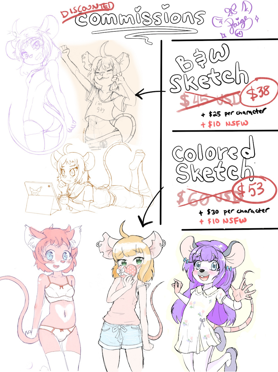 Howdy~! I'm doing some quick discounted sketches to help pay for some bills and groceries! I'm only doing sketches and colored sketches as I'm currently working on a couple bigger projects and don't want anyone waiting too long n.n"