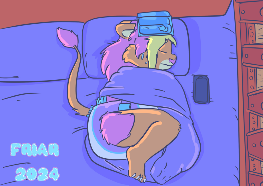 Illustration of Friar the wet and messy diapered lion curled up on his side in a blanket in his crib, one leg sticking out of the blanket revealing his diaper. An ice pack is on Friar's head.