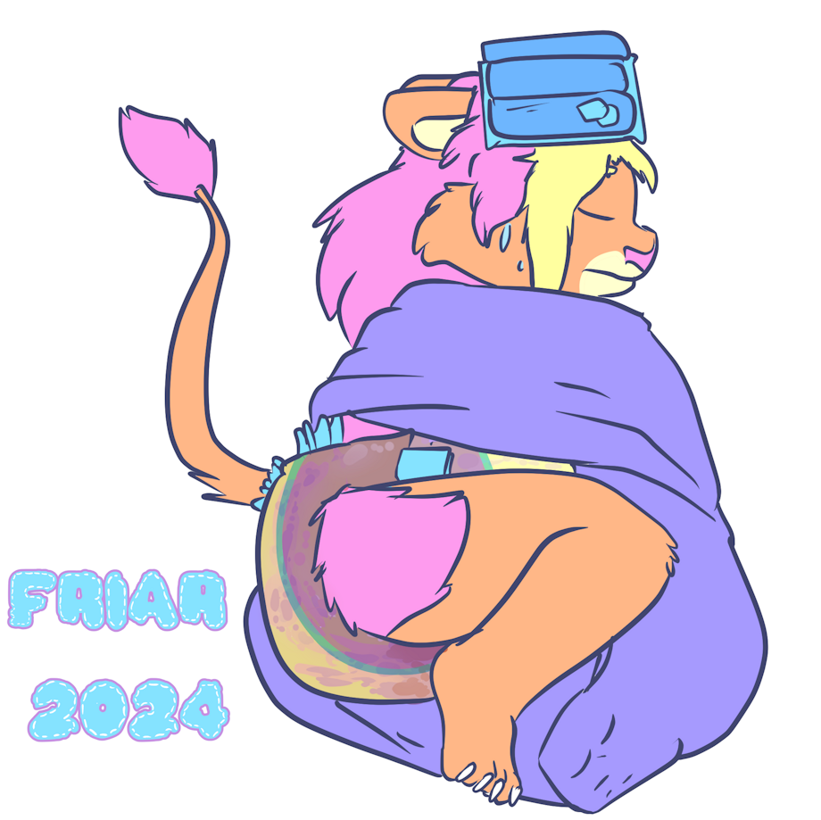 Illustration of Friar the wet and messy diapered lion curled up on his side in a blanket in his crib, one leg sticking out of the blanket revealing his diaper. An ice pack is on Friar's head.