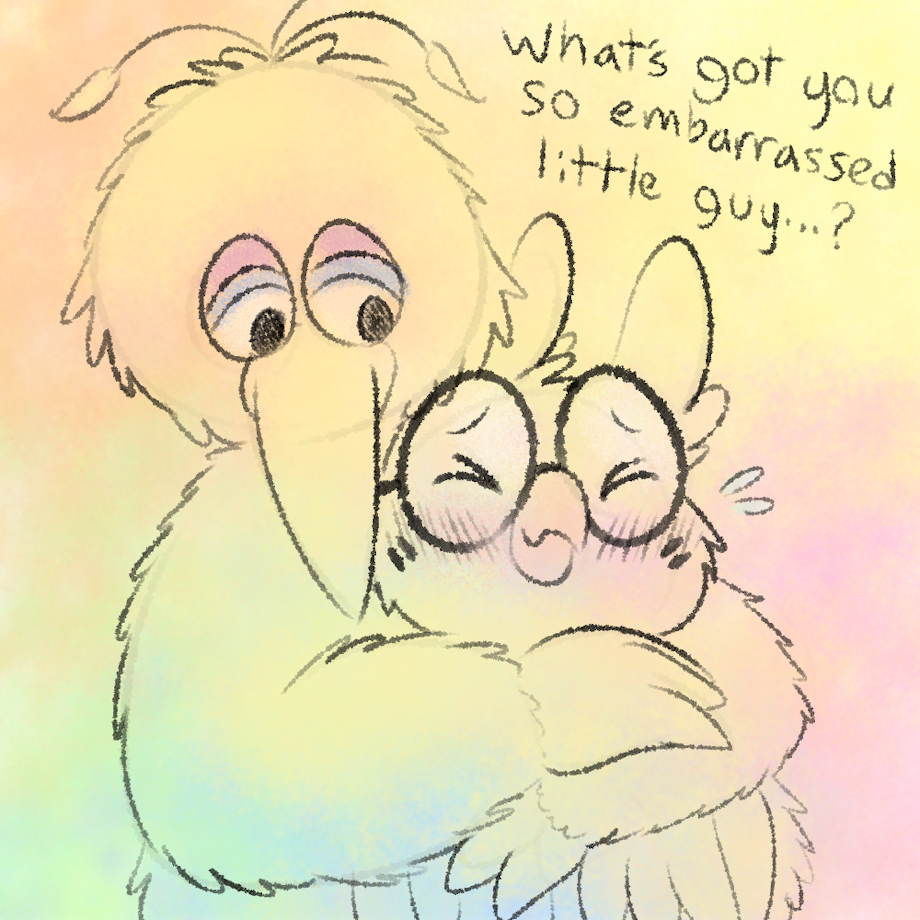 I kind of like to be open and honest when I have weird interests, it's funny! Like, "Really? You find Big Bird more appealing than actual people?" First, have you talked to people? Yes he's way nicer than most actual people, haha. Second, it makes sense on paper - size difference, bright yellow characters, and birds! I just... never thought that'd mean I'd be into this guy. It's like having a crush on Kermit the Frog or something. Thought I had standards and wasn't a complete joke - guess not! OvO;