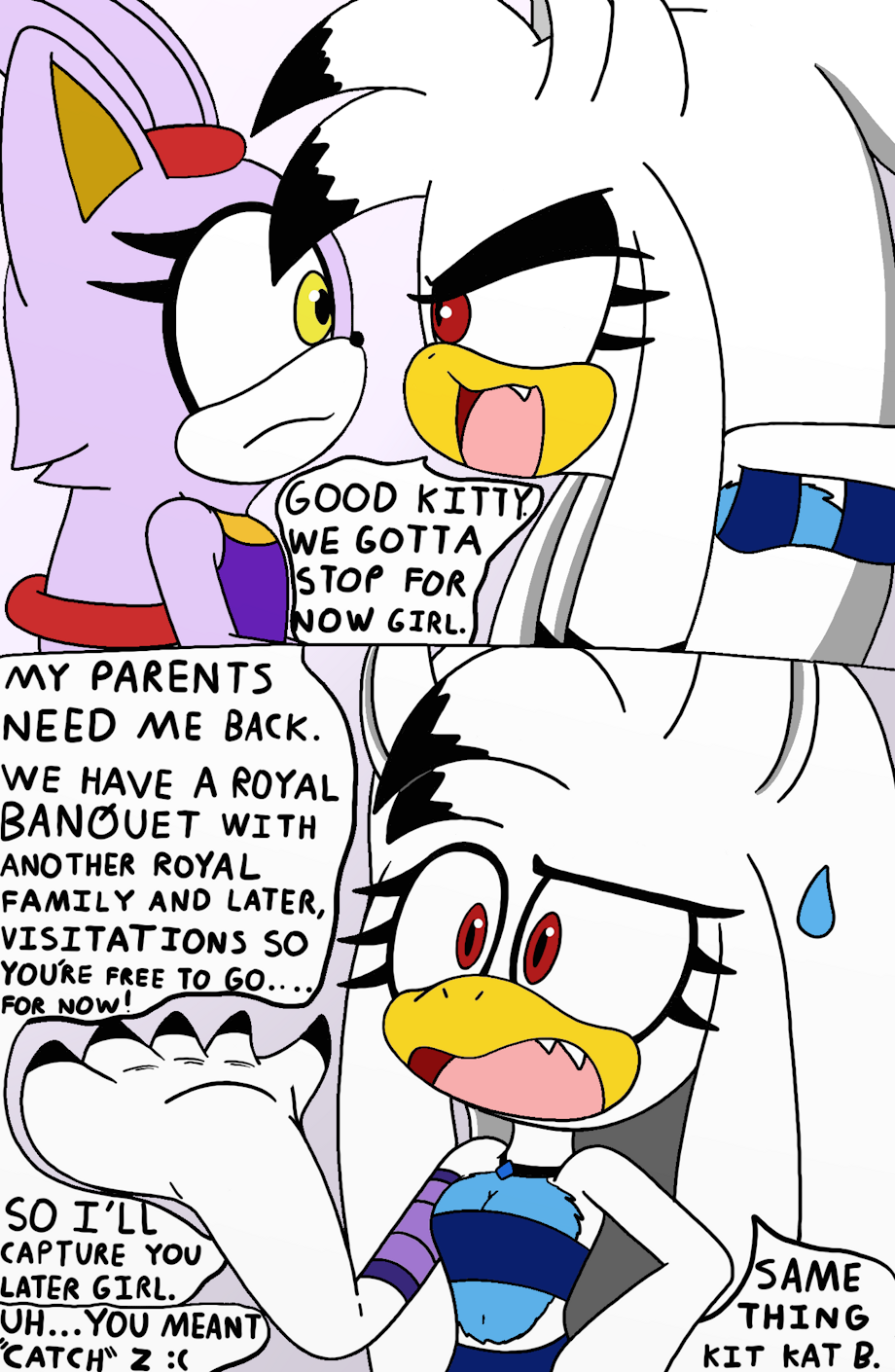 After Frozesha was done having her fun making Blaze submit to her orders on giving her a feet show, she excused the purple Mobian Princess because she herself has royal duties to attend to as a Princess herself. They're both friends, but Frozesha desires to always remain above Blaze.