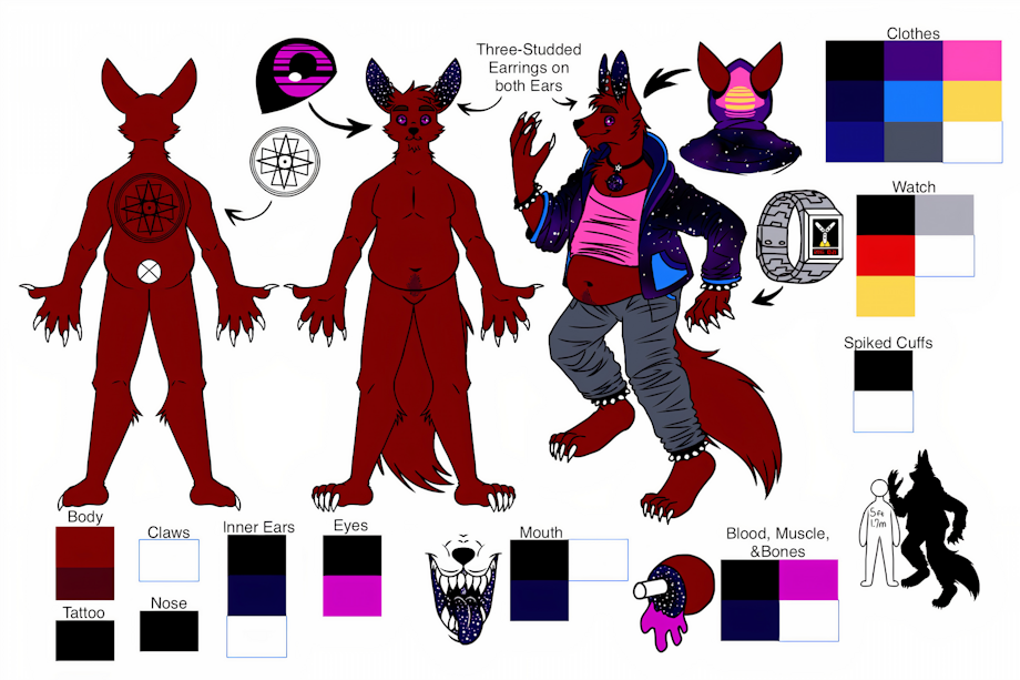 Barn red fur, Glowing blue innards with a spacey theme, Happy trail, Dadbod build, Glowing purple synthwave sun type pupils & black sclera, Tribe symbol on backside, Small beard tuft, Claws