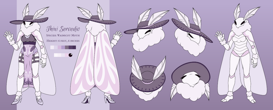 [A reference sheet for an anthro Wainscot moth named Thixi Servedio. She stands 6 feet and 6 inches, and wears a large brimmed hat, a delicately embroidered double-slit dress, and high heeled shoes. She has a fluffy mane around her neck and her wings hang from her shoulders like a cape. Her mouth is typically hidden. The ref sheet shows expressions such as happy, angry, hiding beneath her hat, and looking down haughtily. She can also be seen without her clothes, showing her segmented carapace more clearly.]