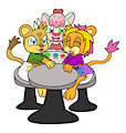 The Bunny Daycare with Amy playing blocks with Bunzo as her baby sister Sierra curiously crawls toward while Zifa draws a picture on the table.
