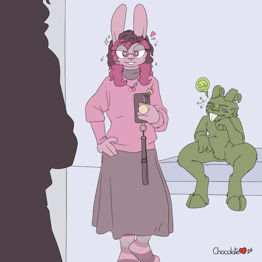 I couldn't leave out my good friend Gender Dysphoria, since this felt like the perfect way to show the fucker up and put it in its place. I also figured it'd be a fun way to show how good vibes affect it (thinking about it, it very much feels like an inverse version of Soul Choco, but that shouldn't be too surprising). That said, I didn't like him cramping my style too much either, so over on my website you can find a slightly altered piece I made to look like a standard selfie I might've taken bunself (which I did do). 💝