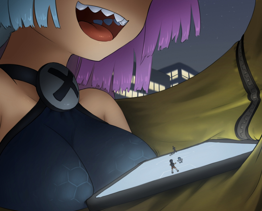 Oooh, now that's a fantastic Ionopener indeed! Real creative idea and cool inspiration to take from the references, the device screen gives her a nice and easy well lit view while also providing a battle stadium for the "micro"s! How versatile alongside her normal uses! And she certainly seems to be enjoying the whole setup, judging by what we can see of her face! Adorable sharpteeth and cute tongue! It's rare to see Iono's surprisingly big chest as it is thanks to her coat, having the hexagonally patterned top lit up by the screen while it squishes into her chest a bit is such a great view! Cute shoulders as well. I like how you did the panoramic rim of her oversized coat collar too, makes the area inside of her personal space seem that much more massive. And man, she really DOES have to be big, with how small those trainers are!
