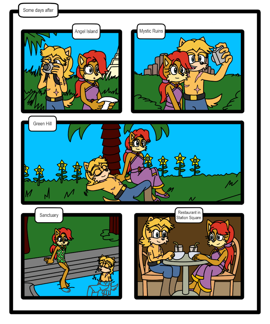A few days after the wedding, Antoine and Sally are already on their honeymoon. Where they are traveling through various places on the planet Mobius. And among the places they visit are: Angel Island, Mystic Ruins, Green Hill, Sanctuary and a restaurant in Station Square.