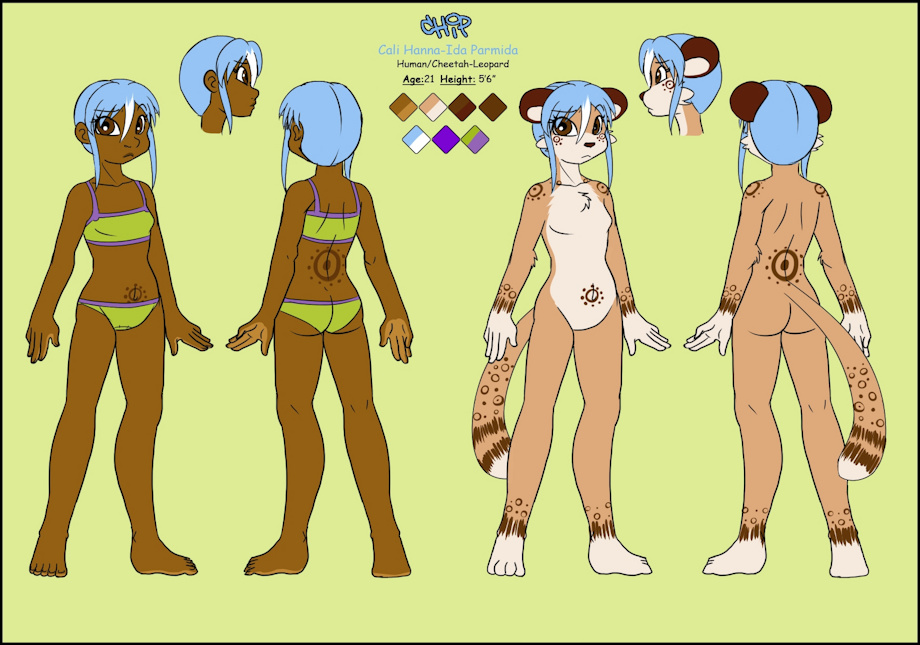 Dark skin, blue-grayish hair, brown eyes, in furry form more cream colored and with markings on belly, back, tail, wrists, shoulders and cheeks
