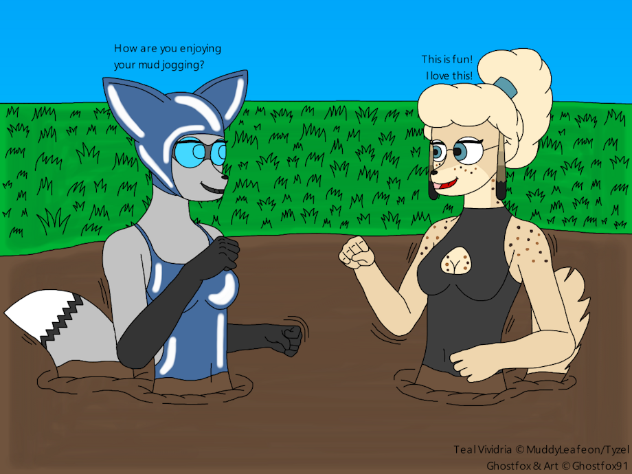 Ghostfox and Teal have found themselves up to their waists in mud. They start jogging and enjoying it.