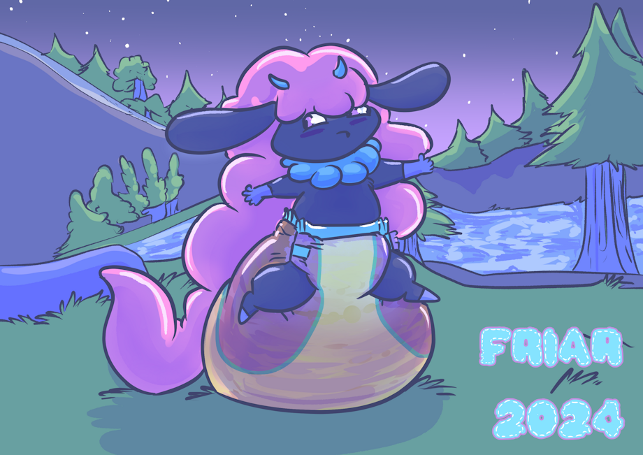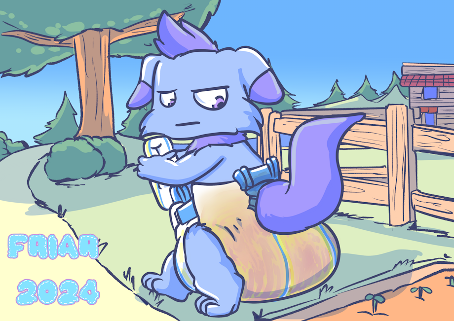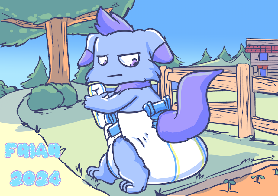 Illustration of a wet and messy diapered Depresso, which is a blue noeseless fox like Pal with a fauxhawk and droopy ears looking behind itself, holding a diaper which it will be changing into. The Depresso is standing next to a wooden fence in front of a recently planted patch of dirt, on a path with a tree beside it. A two story house and trees and stream are in the distance.