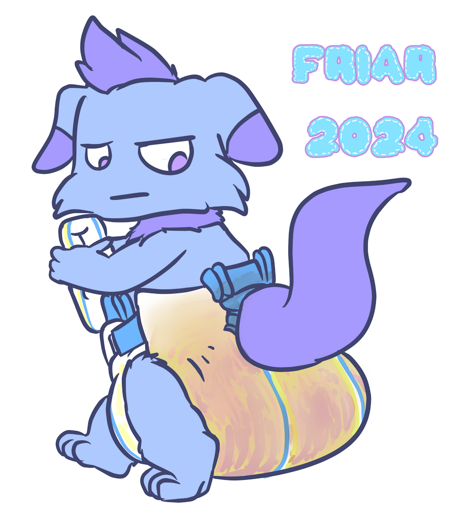 Illustration of a wet and messy diapered Depresso, which is a blue noeseless fox like Pal with a fauxhawk and droopy ears looking behind itself, holding a diaper which it will be changing into. The Depresso is standing next to a wooden fence in front of a recently planted patch of dirt, on a path with a tree beside it. A two story house and trees and stream are in the distance.