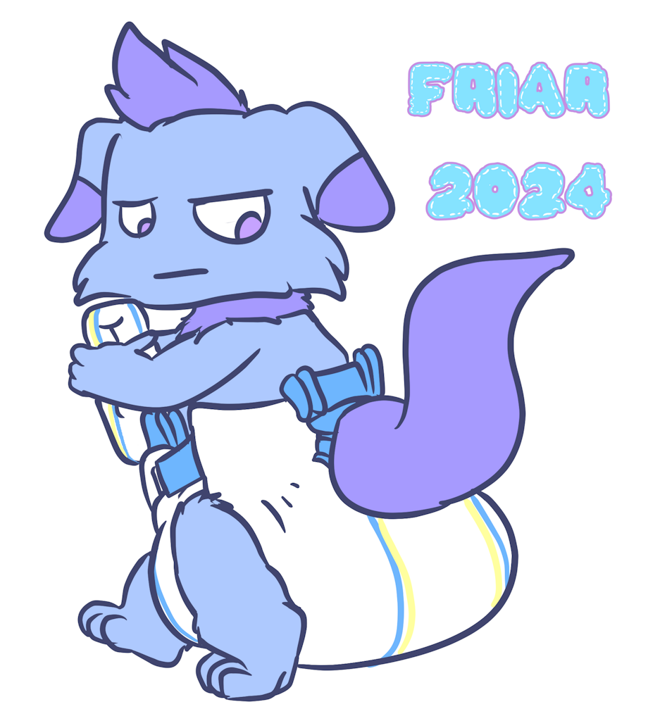 Illustration of a wet and messy diapered Depresso, which is a blue noeseless fox like Pal with a fauxhawk and droopy ears looking behind itself, holding a diaper which it will be changing into. The Depresso is standing next to a wooden fence in front of a recently planted patch of dirt, on a path with a tree beside it. A two story house and trees and stream are in the distance.