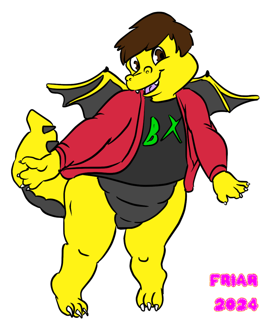 Illustrated commission of a friend's dragonsona, a yellow Dragon Tales style yellow and black tummy scaled dragon with brown hair and brown eyes wearing a red sweater and black B X shirt. Golden sparkles indicate the dragon's magickal abilities.